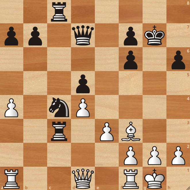 Białe rozstrzygnęły partię wykorzystując słabość taktyczną wieży na f5 – figura ta jest dwa razy atakowana i dwa razy broniona. Nastąpiło 29. S:e6! f:e6 30. H:e6+ Kh7 31. W:f5 z wygraną.